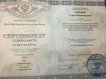 Мой общий врачебный стаж 28 лет. В 1992г. Закончил Нижегородскую Государственную Медицинскую Академию на специальности лечебное дело. Затем 5 дет работал врачом на Государственной Станции Скорой и Неотложенной Помощи. После этого учился в интернатуре при НГМА по психиатрии и получил специальность врача-психиатра -нарколога. Трудился в государственных и частных наркологических клиниках. Неоднократно проходил курсы усовершенствования и специализации. Владею большим опытом купирования острых психотических состояний, лечебным гипнозом, всеми методами кодирования и блокирования алкогольной зависимости.